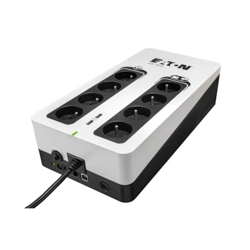 Description du produit par Amazon : Cliquez-ici pour vous assurer de la compatibilité de ce produit avec votre modèle 3S 700 VA 420 watts 8 prises sorties FR 4 prises protection parafoudre batterie de secours - 4 prises protection parafoudre uniquement 2 ports USB pour chargeur (2A max) Protection téléphone box modem réseau 10 100 (RJ45) Disjoncteur réarmable 10A - Pas de ventilateur, pas de bruit (sauf la tonalité d'alarme en cas d’évènements) - UPS avec interface USB (câble USB inclus) 24 mois de garantie Eaton standard (extension de garantie possible en option à 3 ans et 5 ans) Longueur du cordon d'entrée 1,5 m